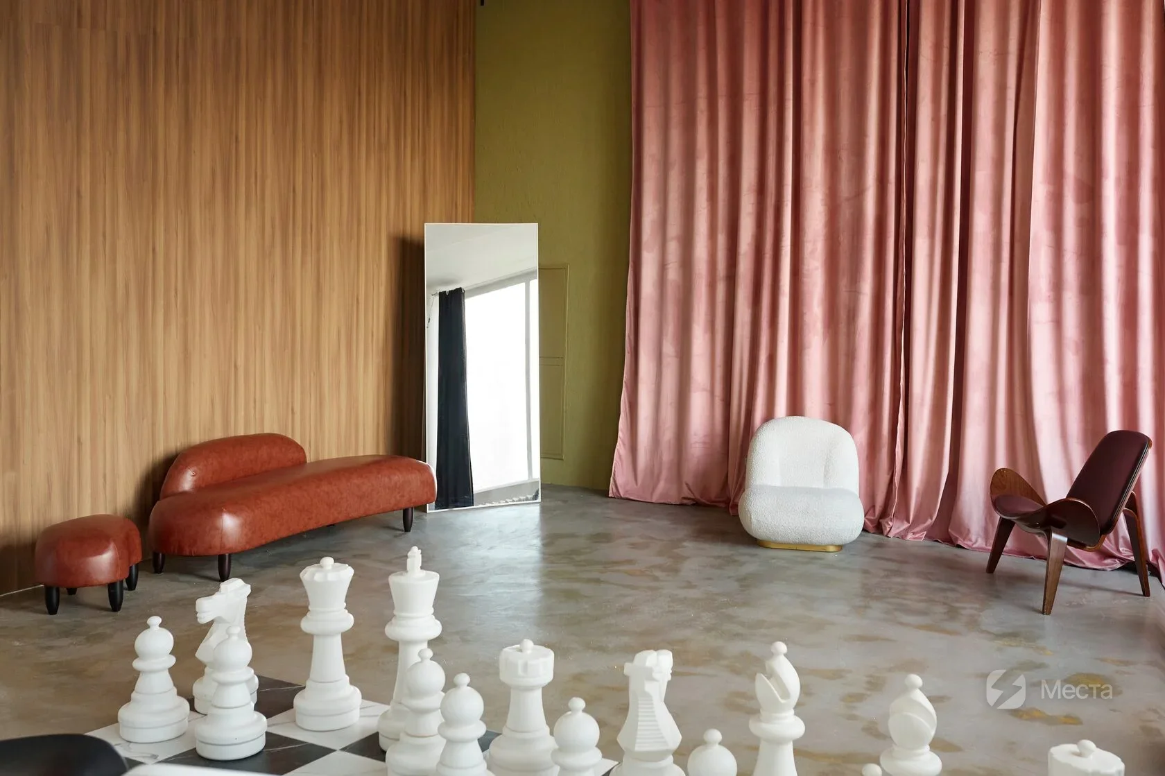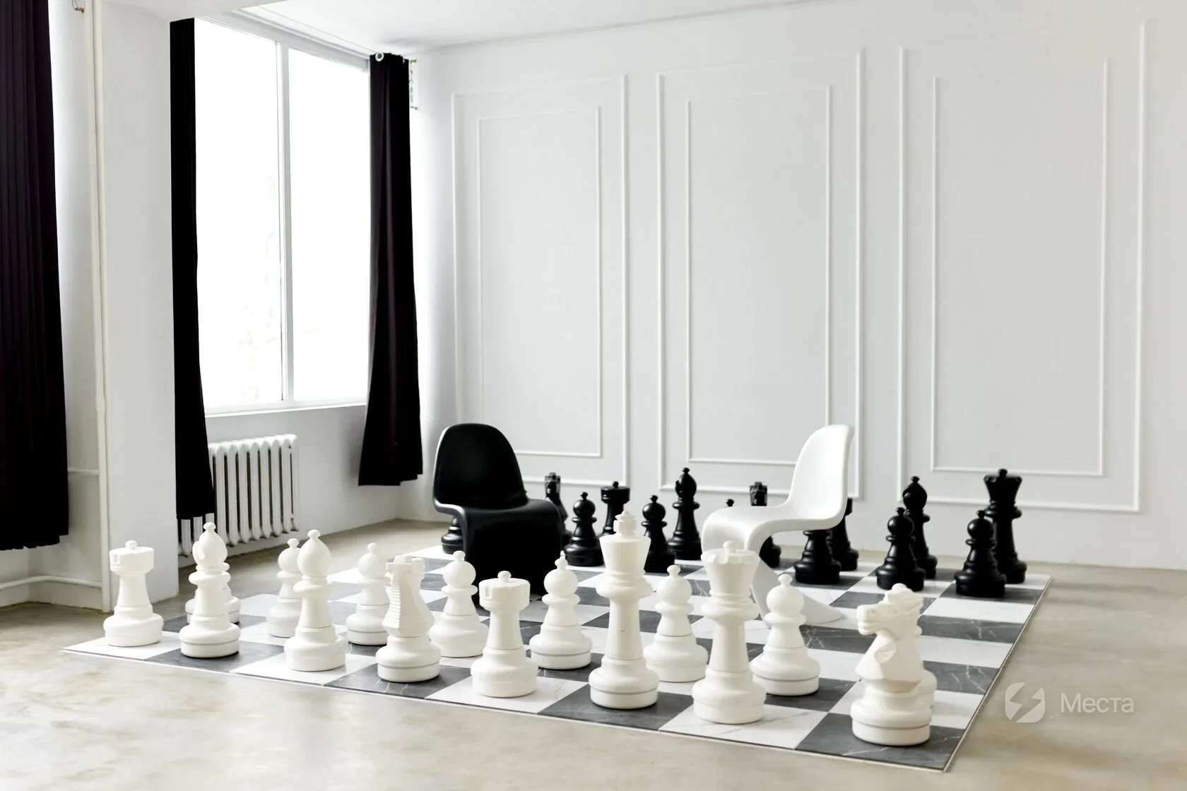 Светлый интерьерный зал площадью 60 м². с большими панорамными окнами, гигантскими шахматами*, манекеном и дизайнерской мебелью. Зал выполнен в лучших традициях французской эстетики. Главным уникальным атрибутом данного зала является шахматная доска с гигантскими фигурами, которая наполнит кадр геометрическими формами, стилем и незаурядностью. Французская классика сливается с большой модой и переносит каждого гостя в мир лучших модных домов. * количество шахматных фигур может отличаться от стандартного игрального (32 фигуры), при необходимости уточните у администратора