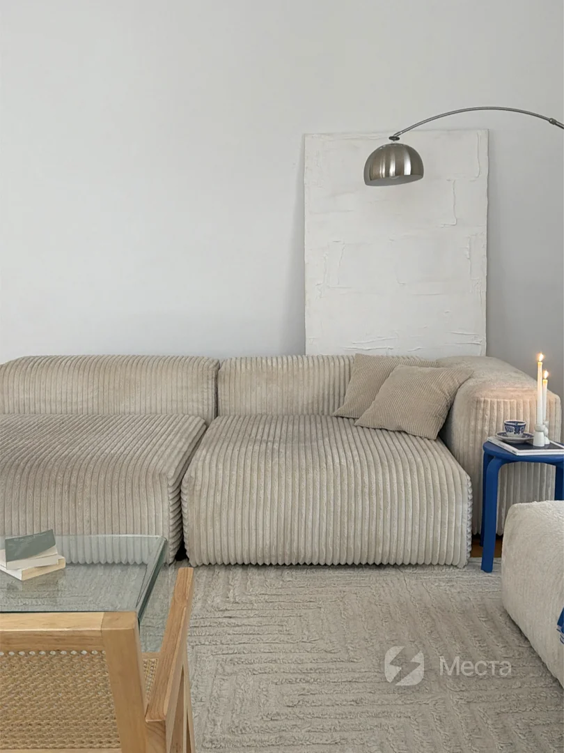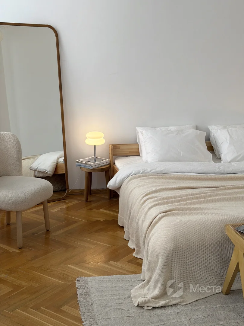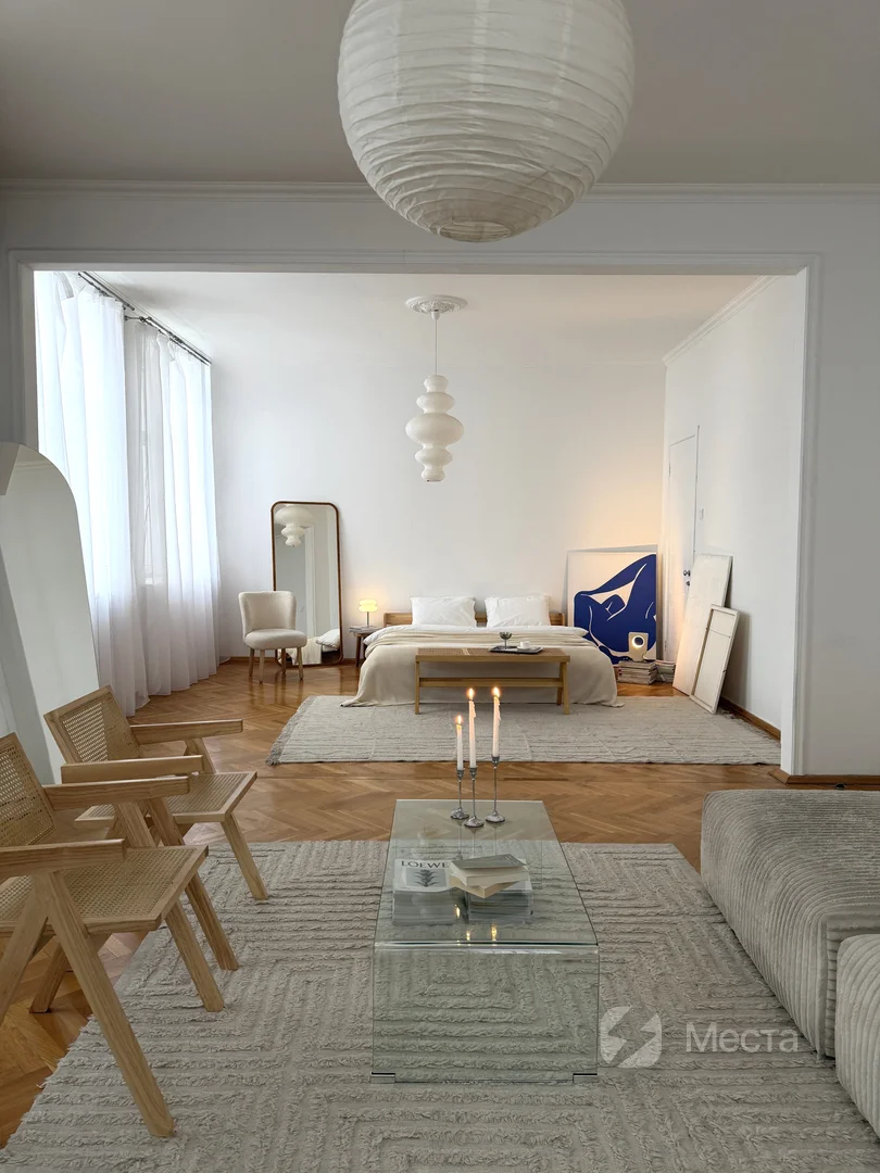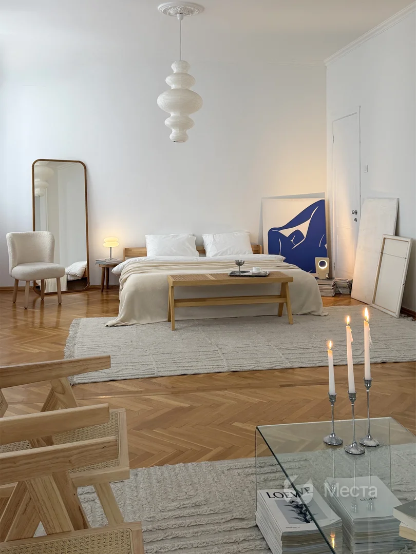 Зал объединил в себе сразу два пространства, создавая десятки зон для создания контента: гостиную и спальню. А также подходит для вечернего бронирование для атмосферных съемок и уютных кинопросмотров с проектором.