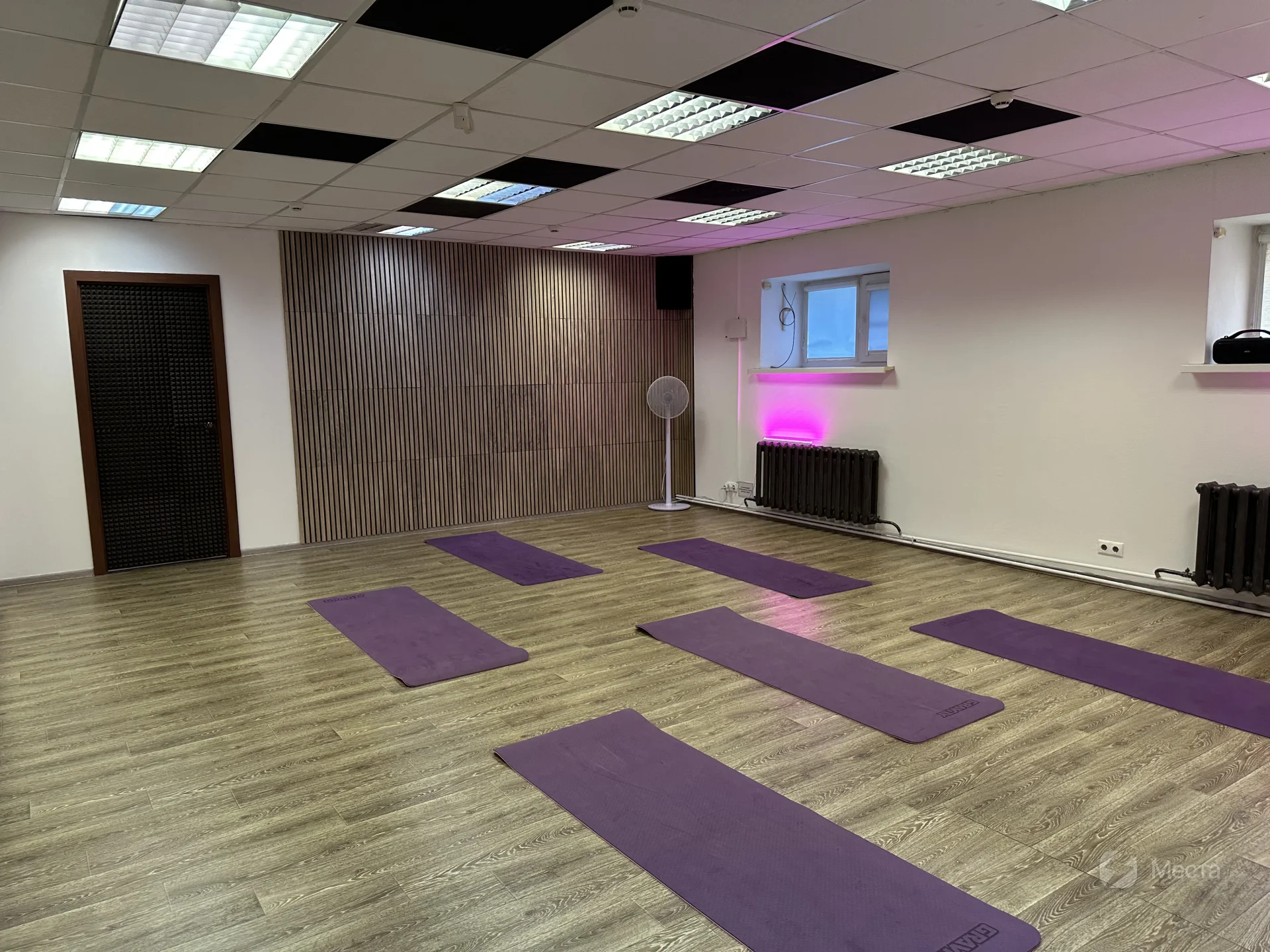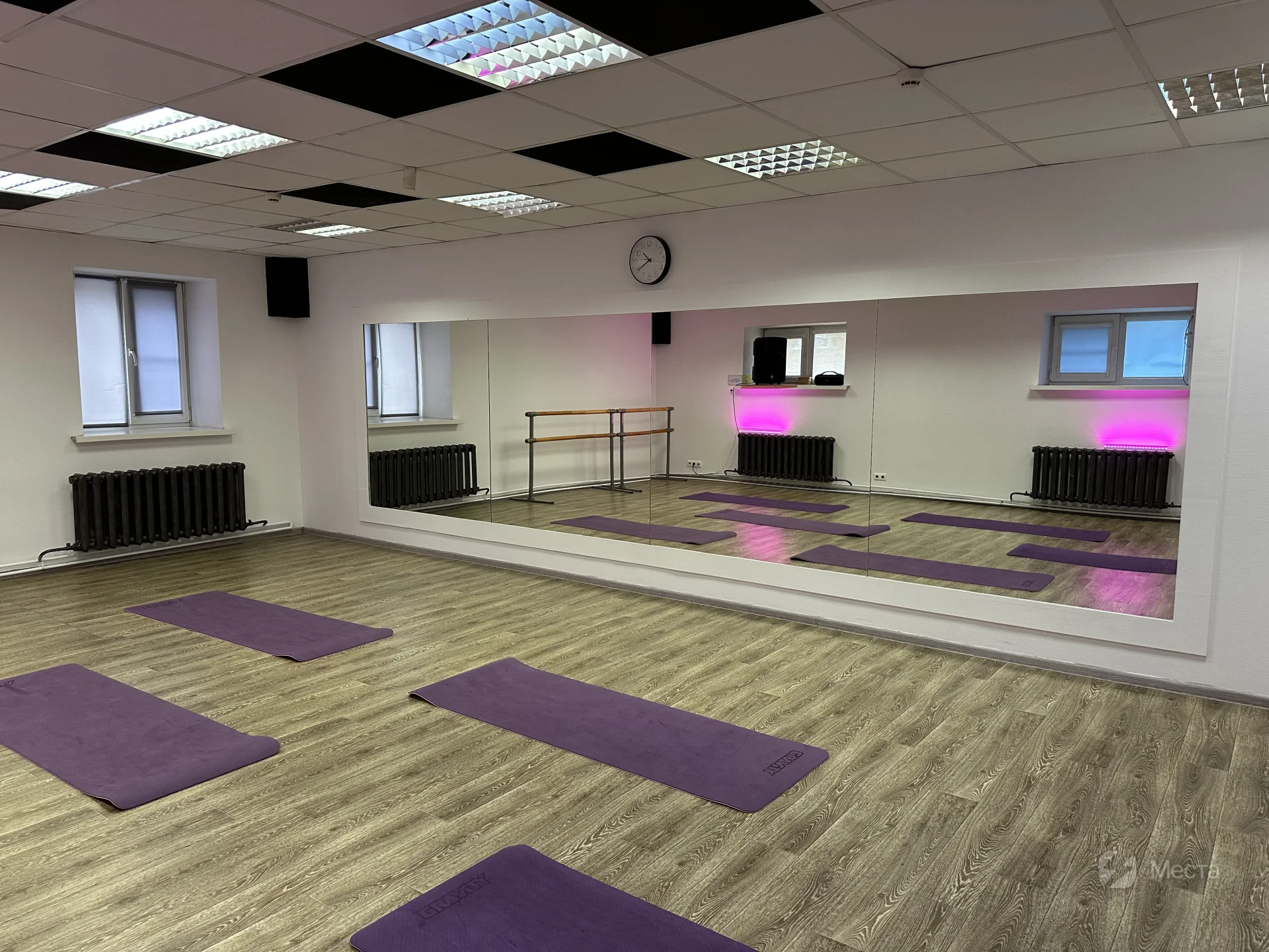 Важно: по соседству находится вокальный класс. Из-за смежности помещений звукоизоляции не 100%, будет отдаленный глухой звук. Для более уединённых тренировок бронируйте второй обособленный танцевальный зал (52 кв.м) — подробности в профиле.