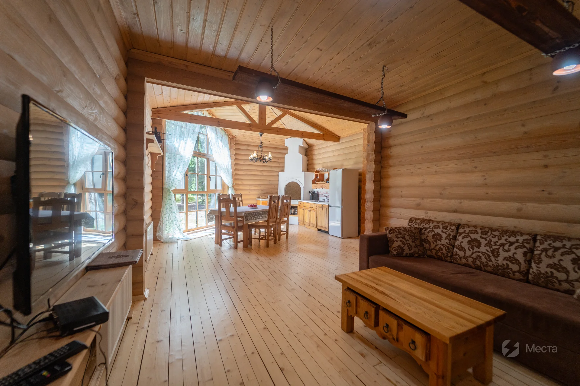 В одноэтажных Русских избах все предназначено для комфортного отдыха в кругу семьи и друзей. Приезжая к нам в гости, Вы разложите все свои вещи в удобные шкафы и прикроватные тумбы, изготовленные из цельного дерева. За завтраком можно собраться всем вместе за большим столом у стилизованной русской печки в светлой и солнечной столовой с панорамным видом на сосновый лес. После обеда полежать на мягком уютном двуспальном диване и посмотреть в просторной гостиной ЖК-телевизор, почитать газеты и книги за журнальным столом.