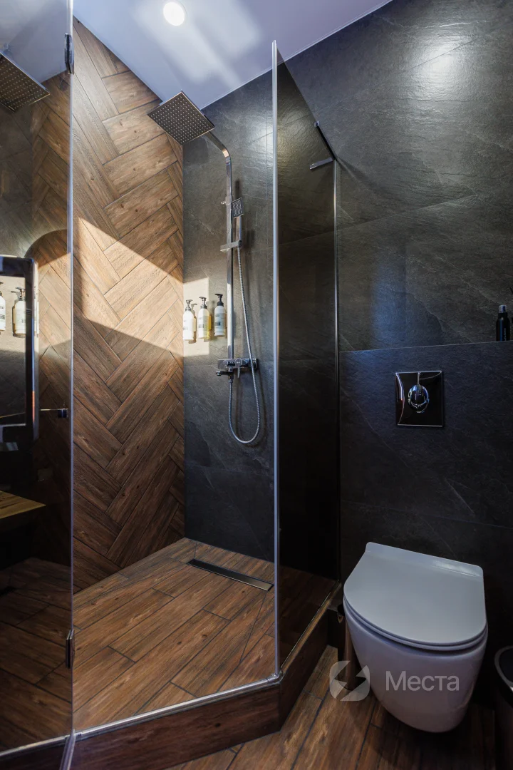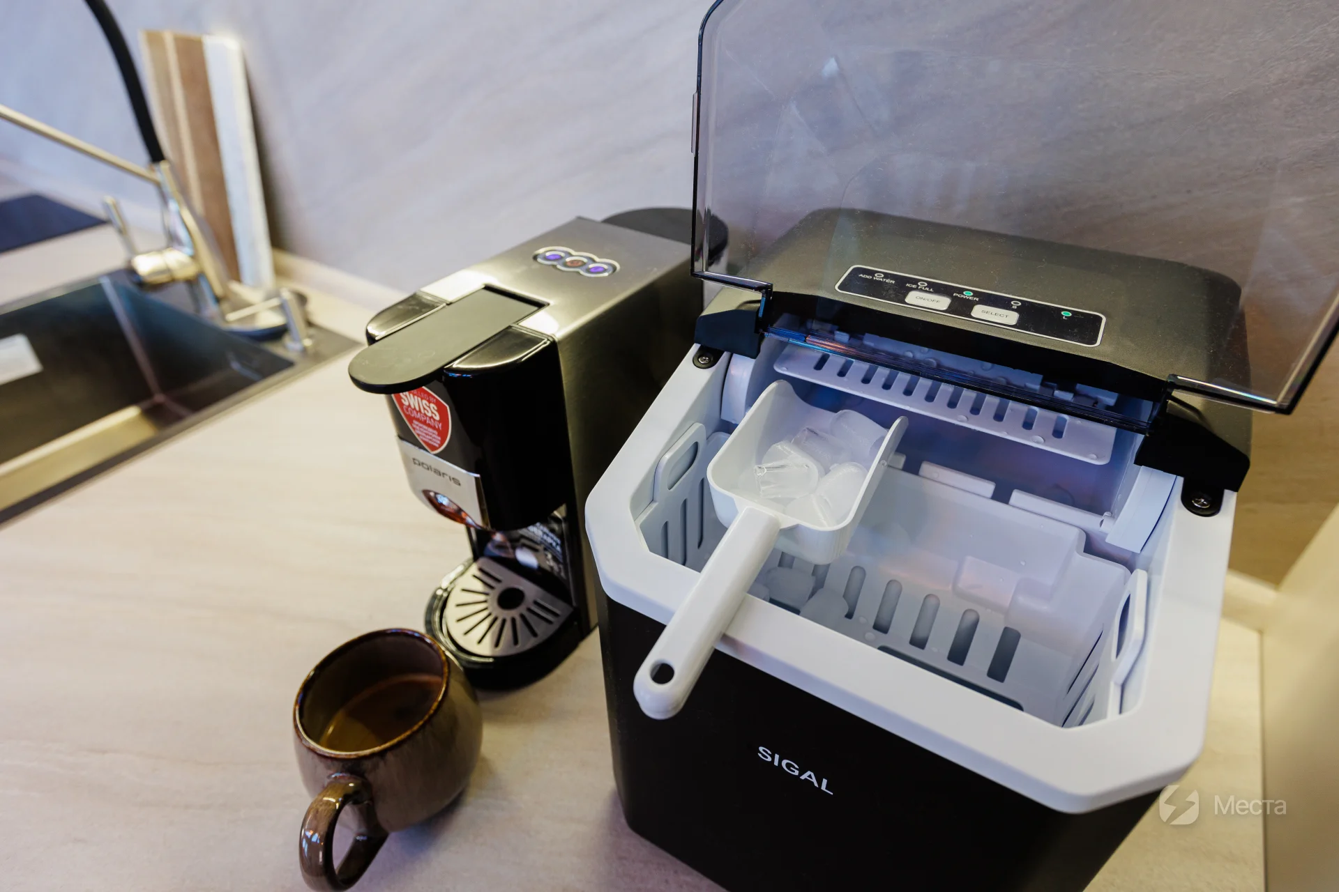 Стильная встроенная кухня оснащена всем необходимым: индукционная плита, микроволновка, чайник, кофемашина, ледогенератор. А за большим столом из натурального дерева сможет разместиться большая компания.