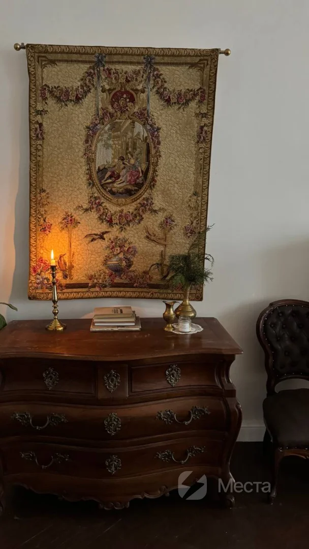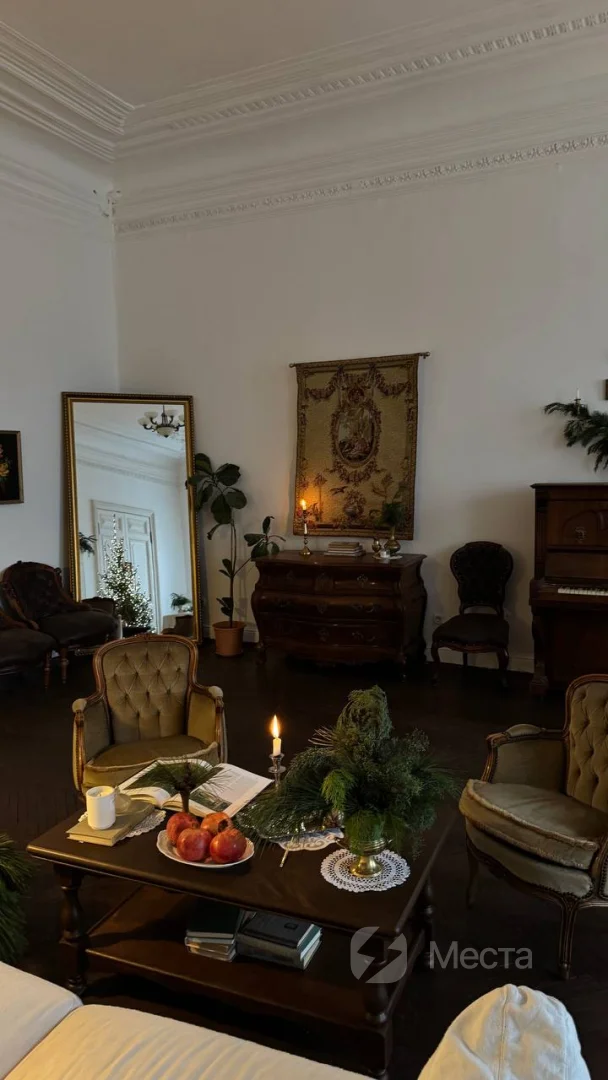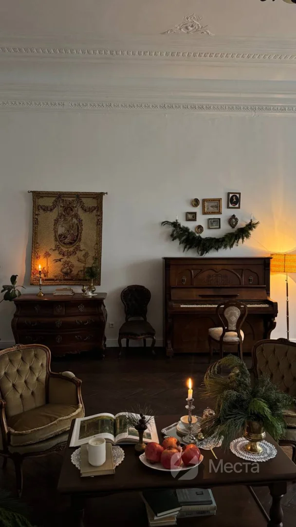 Камин с ажурной гипсовой короной, антикварные шкаф и фортепиано с галереей фотокарточек над ним, диван и гобелен с французской вышивкой и другие детали, создающие уют и атмосферу.