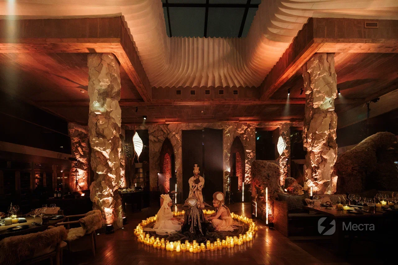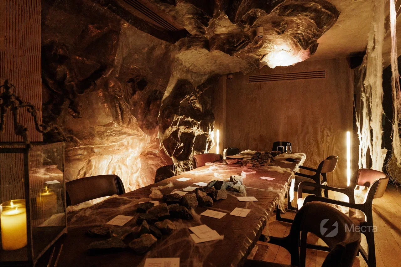HISTORIA — концептуальное двухэтажное event-пространство в самом центре Москвы. Ресторан делится на несколько зон: храм, грот, балкон, пещера и каминный зал, каждое из которых несет свою особую энергетику. Зал «Пещера» вмещает до 14 персон. Площадь составляет 18 м². Каминный зал вмещает до 12 гостей, площадь — 40 м². Также есть возможность размещения на балконах, общая площадь которых составляет 150 м². Отдельный зал вмещает от 10 до 30 персон.