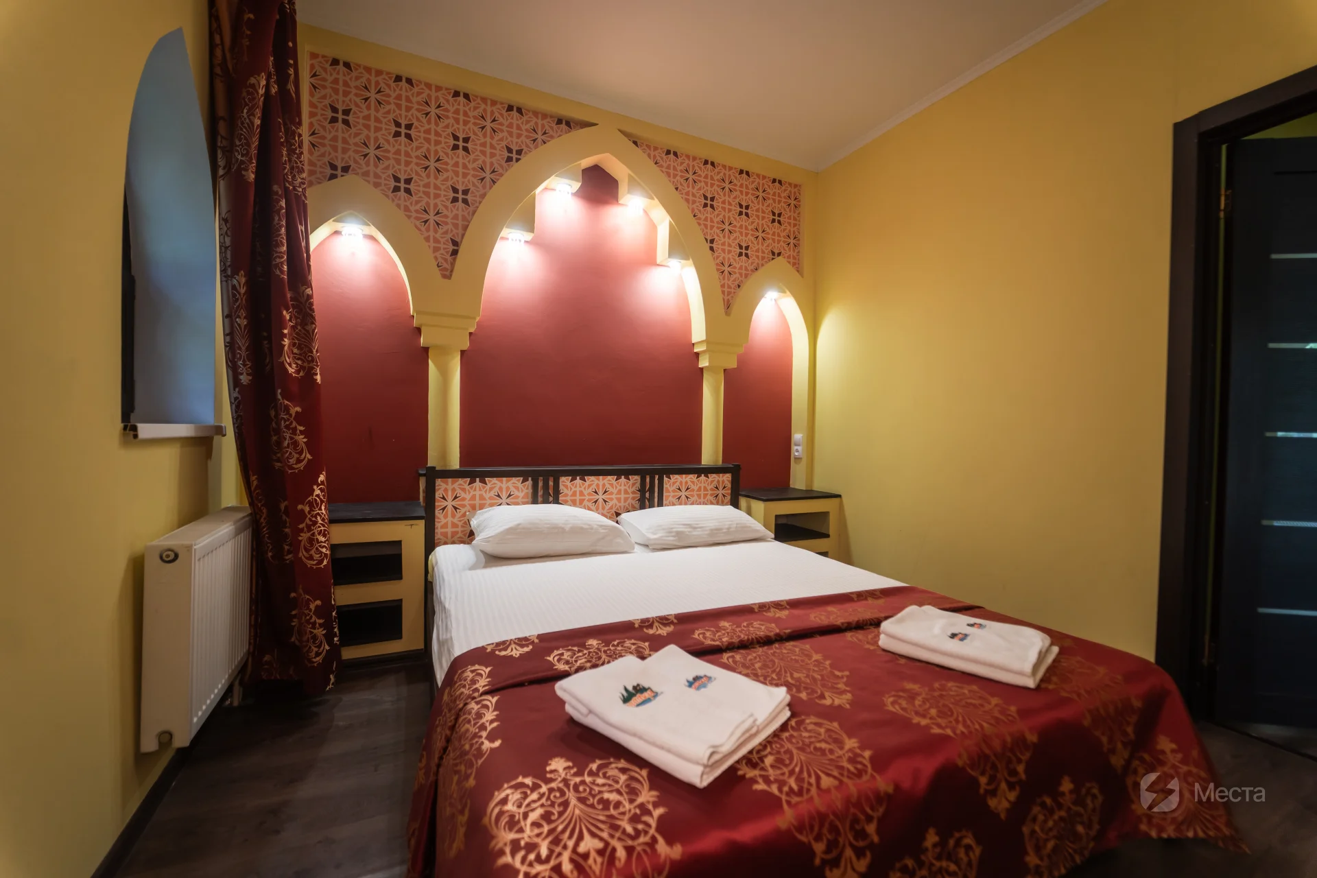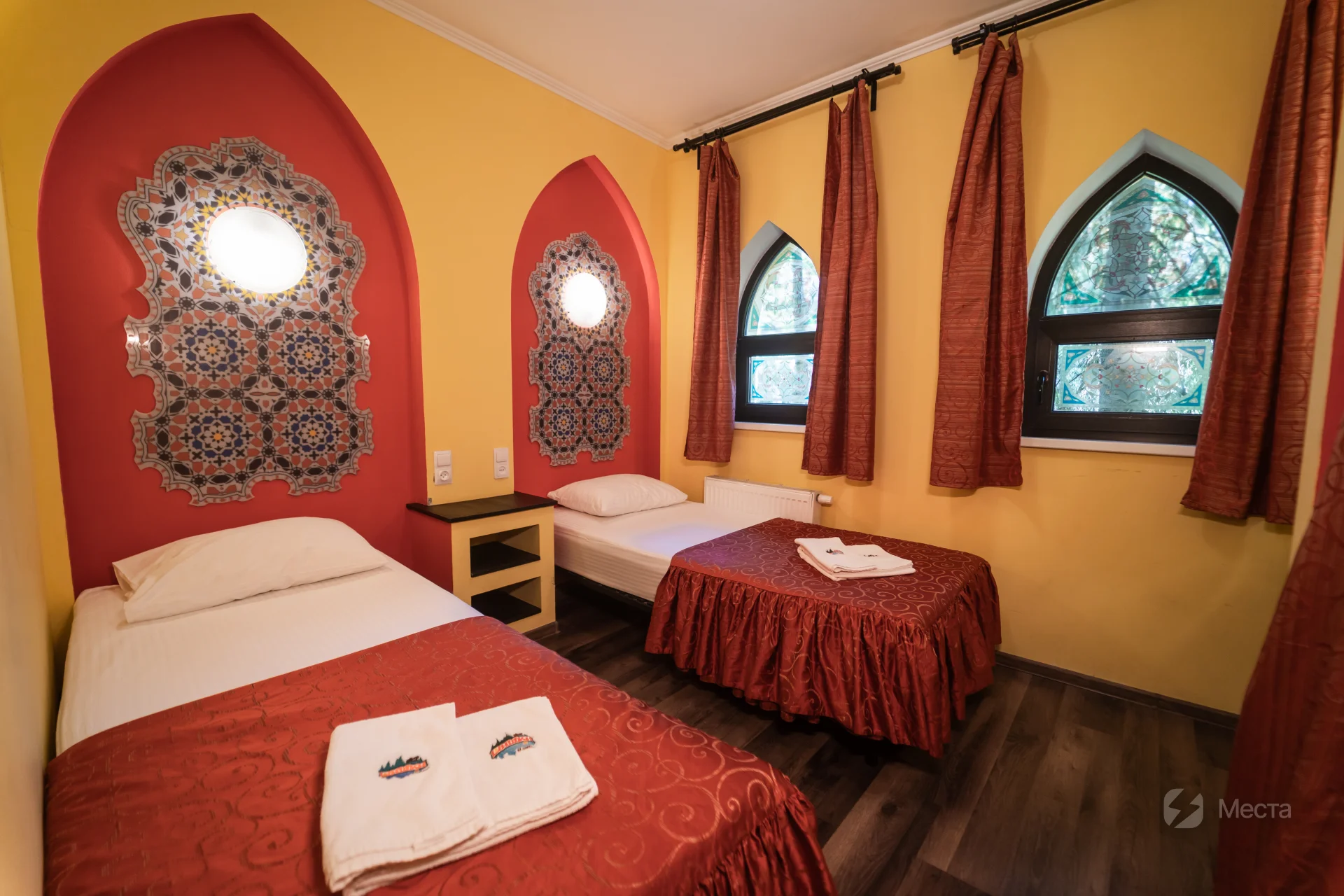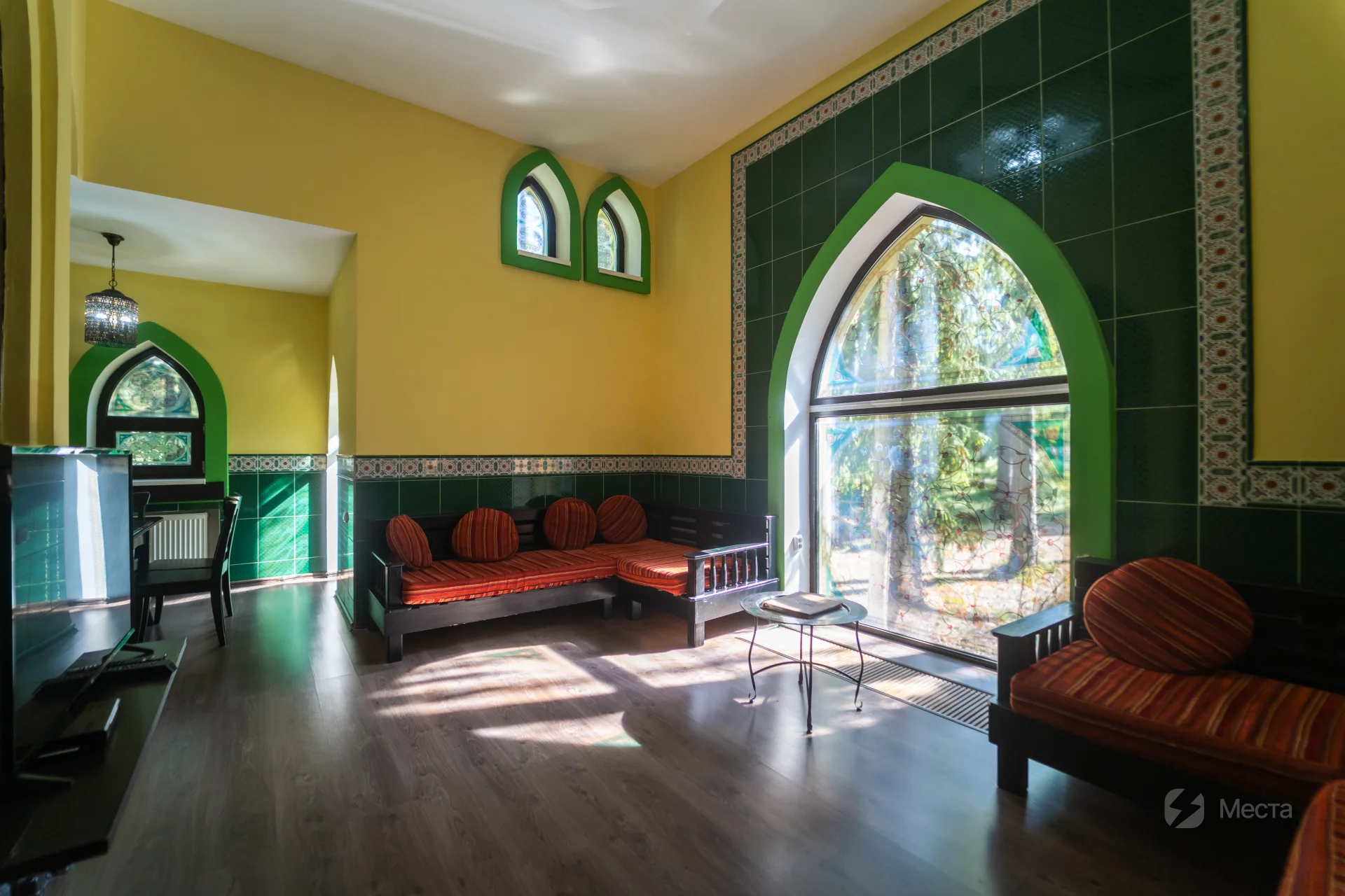 Неповторимый внешний вид, острые своды дверей и окон, уникальные мозаики и лепнина – создают незабываемое ощущение нахождения в восточной сказке. Внутреннее убранство поражает своей гармоничностью и комфортностью. Просторная светлая гостиная с мягкими тахтами и большими окнами-витражами наполнена игрой разноцветных солнечных лучей, а спальни с воздушными балдахинами и задрапированными тканью шкафами созданы для неги, завершает это великолепие Звезда Востока – прекрасная восьмиконечная люстра.