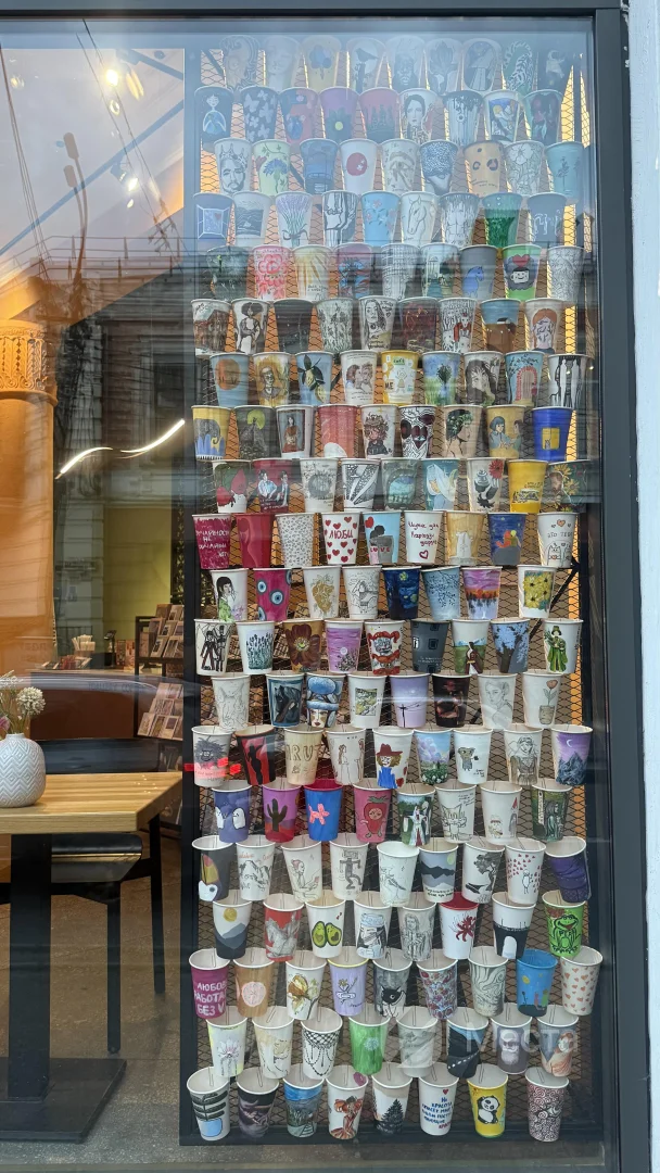 Кофейня, винный бар, галерея и немного книжный. У меня традиция — покупать здесь журнал современной мысли Кавказа «Дарьял». Панорамные окна украшены стаканчиками, которые разрисовали гости. Разрисовать свой стаканчик может каждый :)