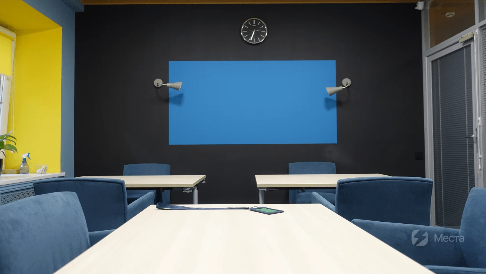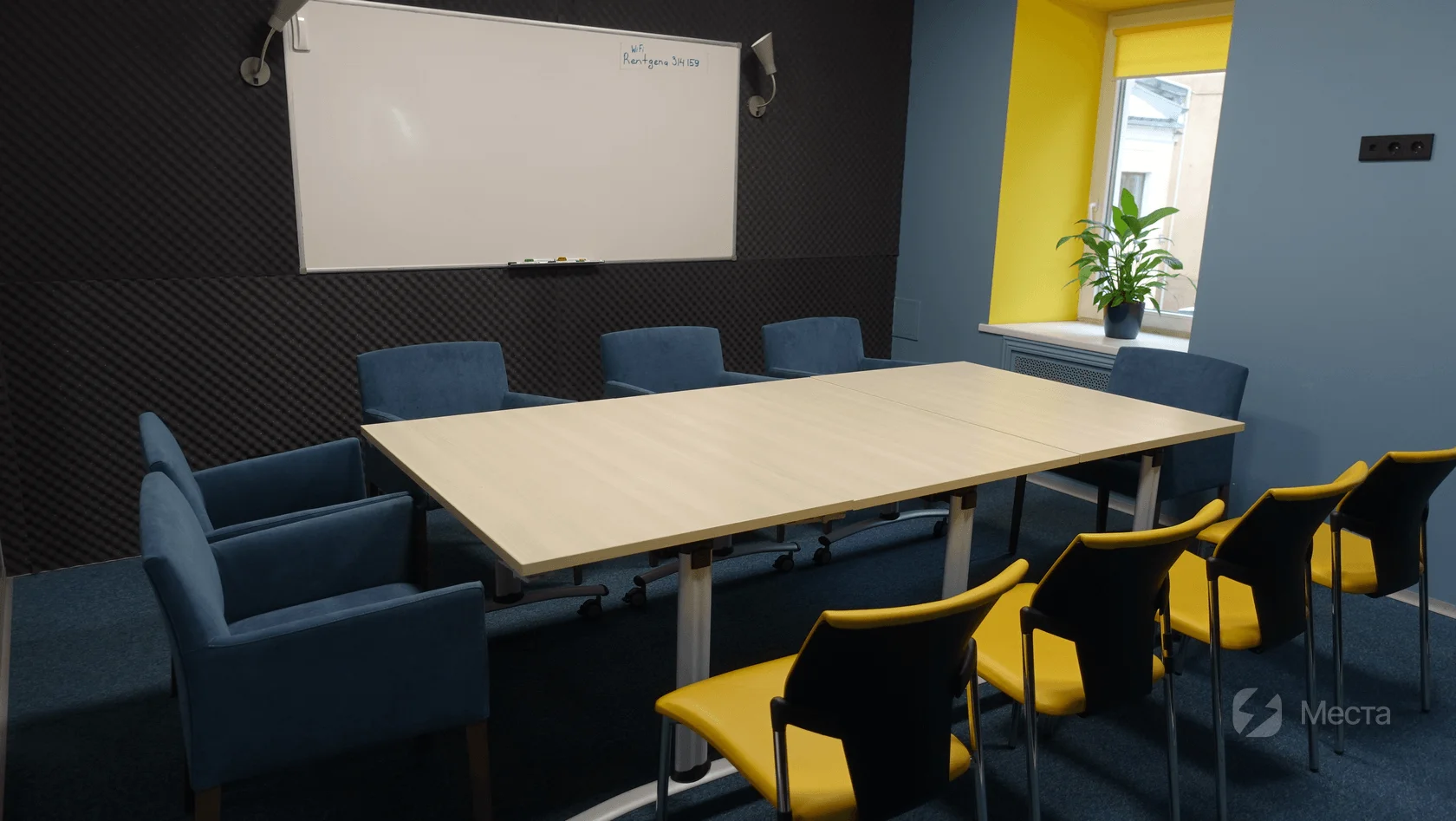 В комнате есть целая стена для рисования мелом и большая магнитно-маркерная доска 200*100 см. Если же вам нужно еще больше пространства для визуализации ваших идей, то дополнительно можем предоставить фасилитационную стену.